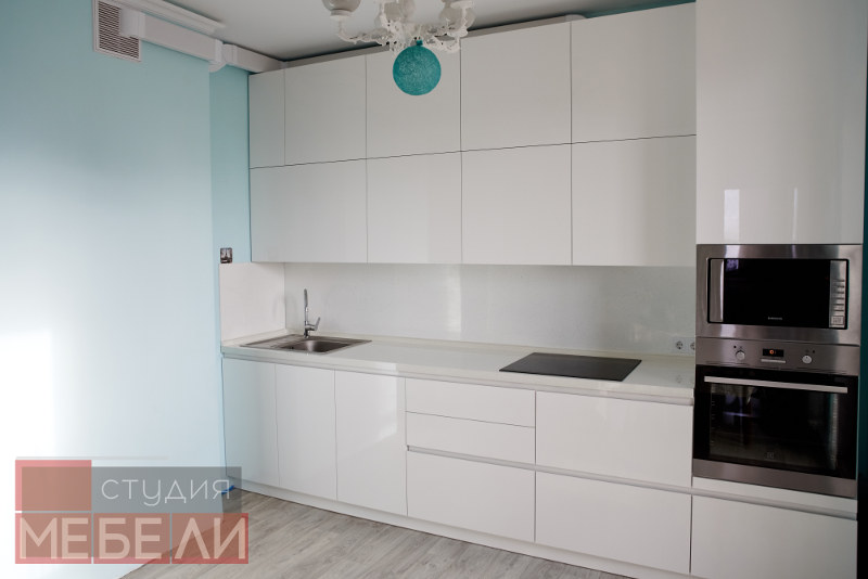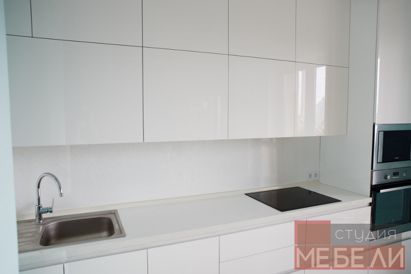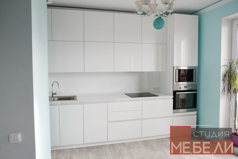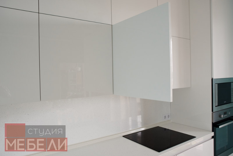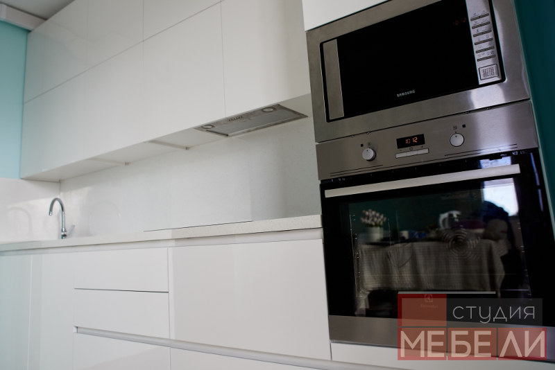 Минимум элементов, прямые линии и универсальный белый цвет – тренд в дизайне, который пришел всерьез и надолго. Ведь не всем нравится большое количество декора или открытых элементов. Белые глянцевые фасады из акрила не только выглядят аккуратно, но ещё и являются устойчивыми к воздействию влаги, температуры и механическим повреждениям. Благодаря повторяющимся формам, навесные и выдвижные шкафы создают своеобразную «плитку», а интегрированные ручки не притягивают дополнительного внимания. Кухня смотрится лаконично и стильно.