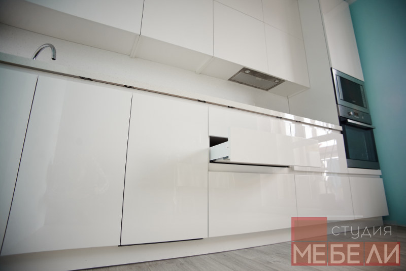 За удобство и функциональность использования отвечает немецкая фурнитура Hettich, грамотно подобранная нашими дизайнерами. В данном гарнитуре использована система выдвижных ящиков ArciTech с нагрузочной способностью до 80 кг. А в навесных шкафах применены петли Sensys с функцией Push to Open : легкое касание – и двери закрываются плавно и бесшумно.