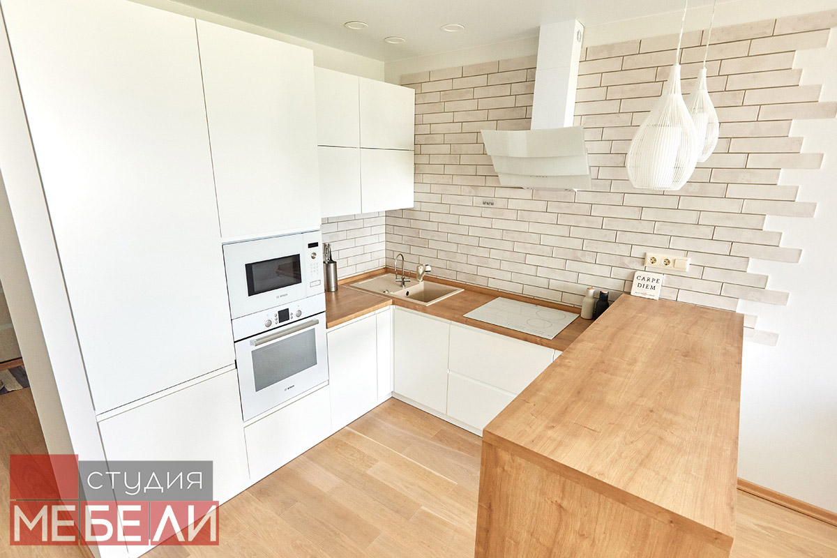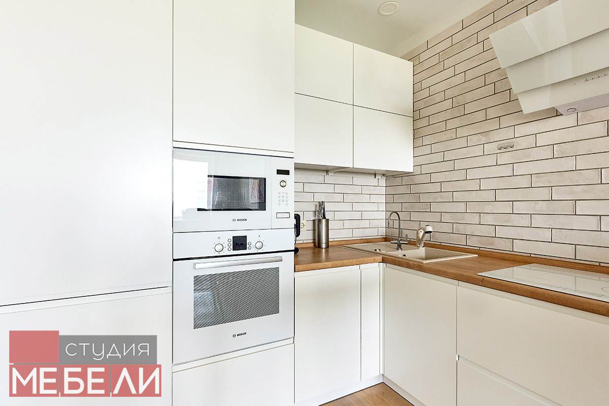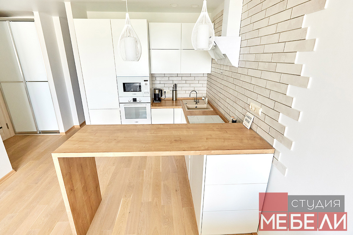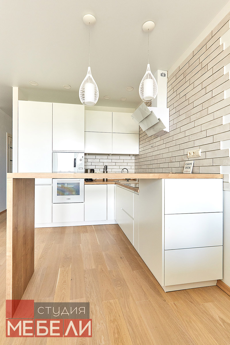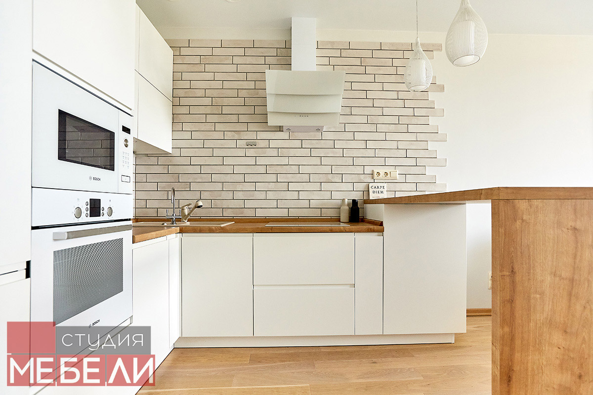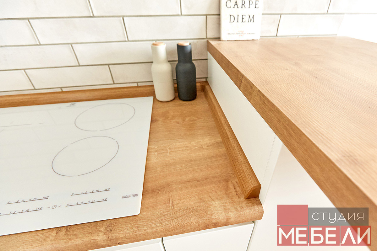Наши специалисты нашли отличное решение для людей, предпочитающих минимализм. Светлые тона, скрытая фурнитура и максимум функциональности в ограниченном пространстве. Благодаря матовым фасадам из МДФ «Система» оттенка RAL9016 с интегрированными ручками, кухонный гарнитур идеально подойдет к любому интерьеру. Завершенный образ Вашей кухне придают столешницы и остров, выполненные из туи. Последний не только увеличивает рабочее пространство на кухне, но и станет отличной зоной для отдыха и общения. Финальный штрих – каменная мойка TEKA, подобранная в общей стилистике.