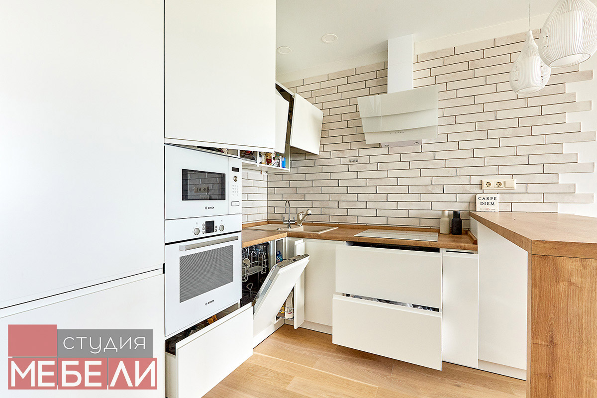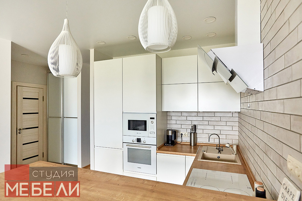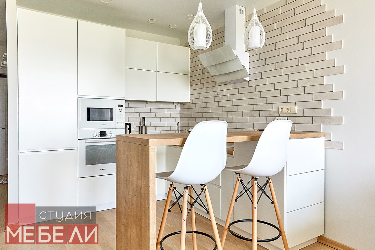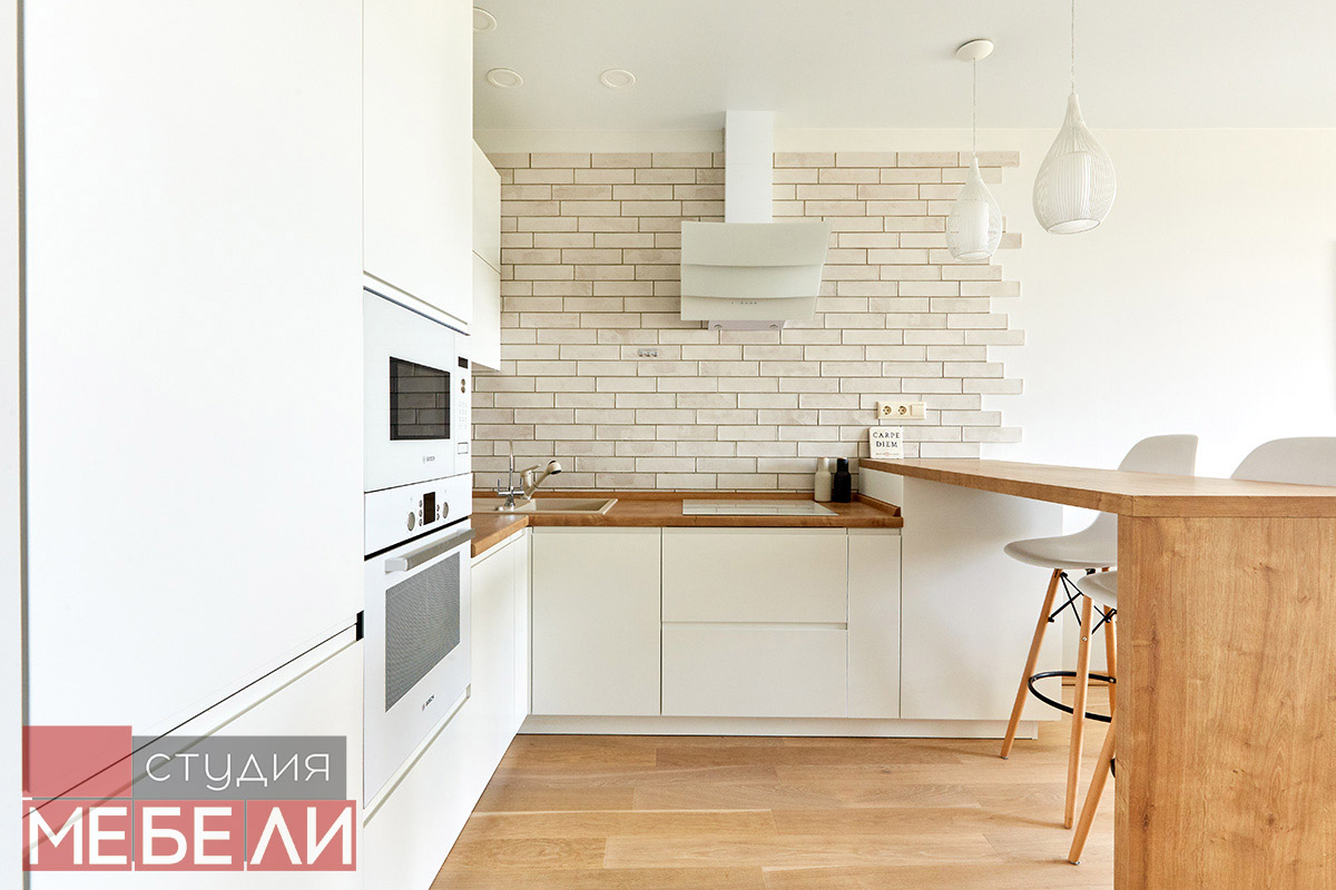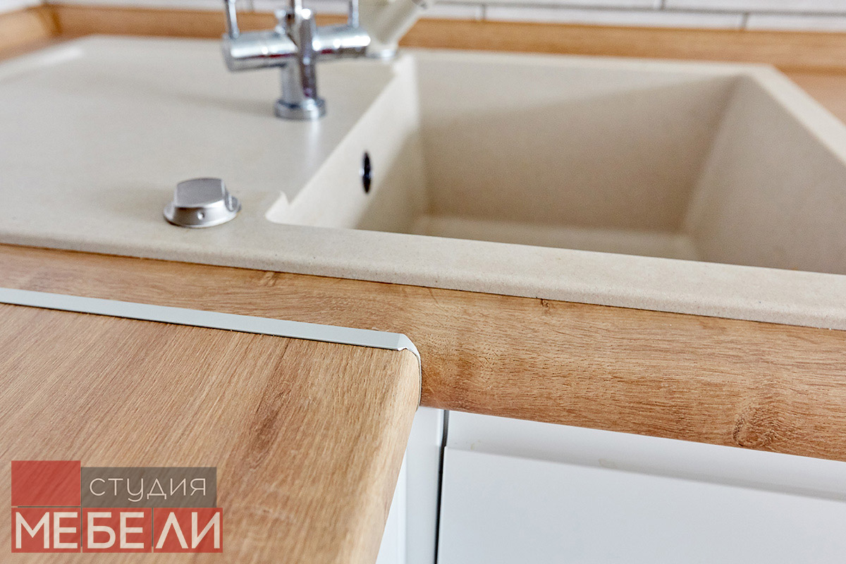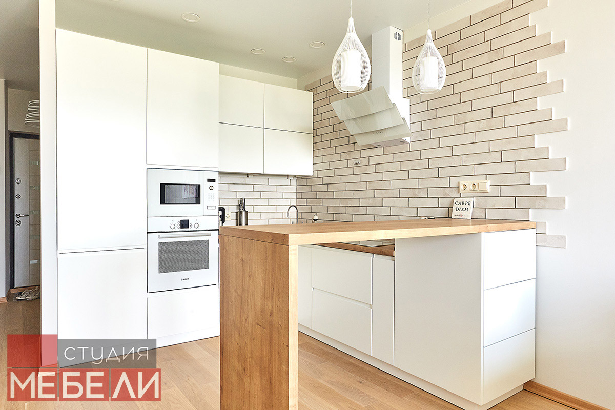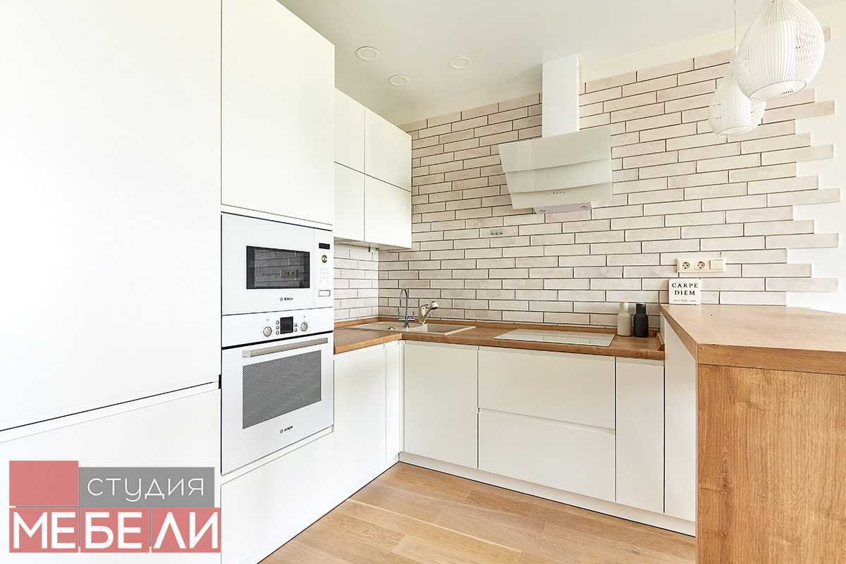 Наши специалисты нашли отличное решение для людей, предпочитающих минимализм. Светлые тона, скрытая фурнитура и максимум функциональности в ограниченном пространстве. Благодаря матовым фасадам из МДФ «Система» оттенка RAL9016 с интегрированными ручками, кухонный гарнитур идеально подойдет к любому интерьеру. Завершенный образ Вашей кухне придают столешницы и остров, выполненные из туи. Последний не только увеличивает рабочее пространство на кухне, но и станет отличной зоной для отдыха и общения. Финальный штрих – каменная мойка TEKA, подобранная в общей стилистике.