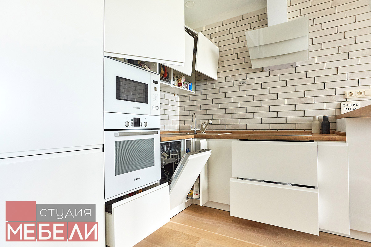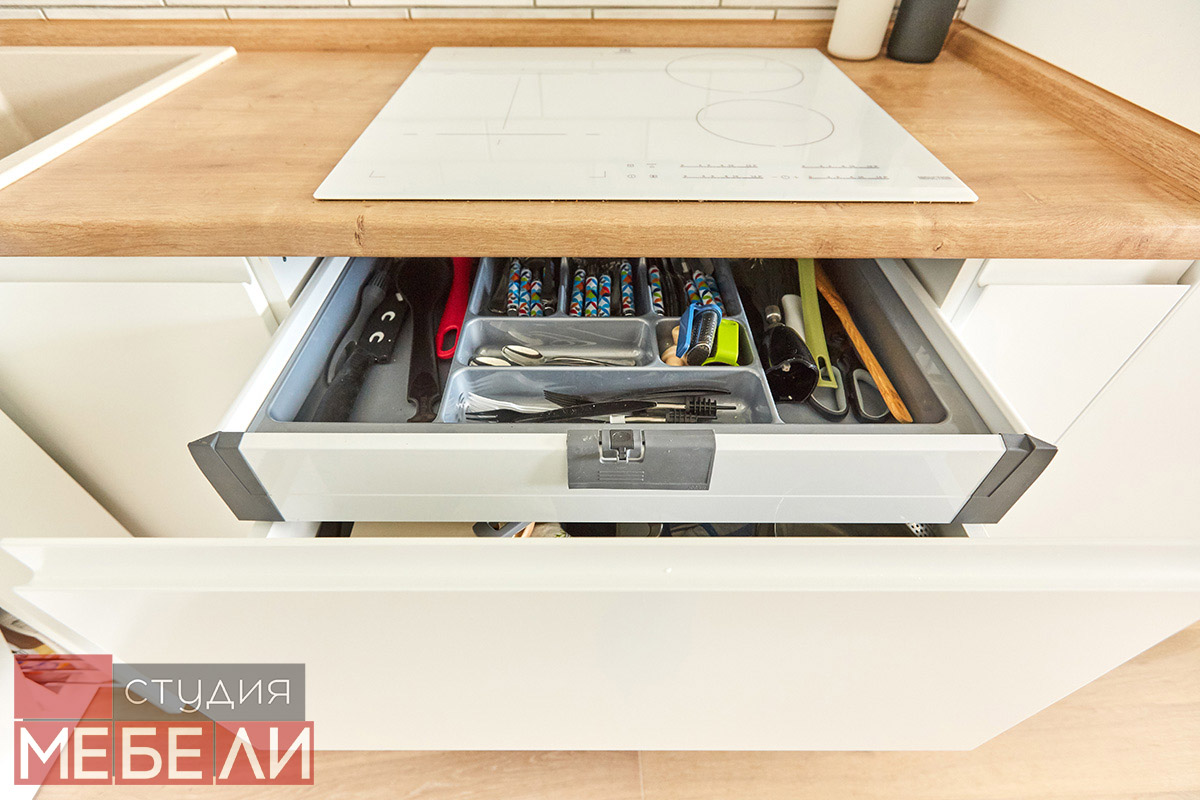 Функциональность использования гарантирует качественная европейская фурнитура Blum и Hettich. Система скрытых направляющих для деревянных ящиков TANDEM гарантирует плавное скольжение и комфортное использование кухни, благодаря им даже тяжело нагруженные ящики скользят как невесомые. Выдвижные механизмы BLUM Tandembox Tip-On идеально подойдут для использования мебели без ручек, а складные подъемные механизмы AVENTOS HF от BLUM помогают экономить место в верхнем пространстве.
