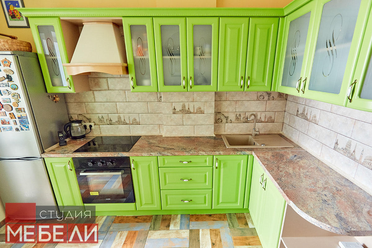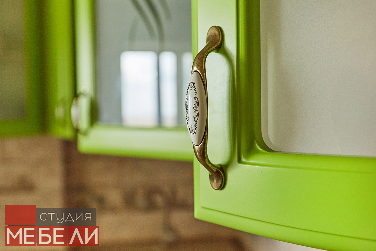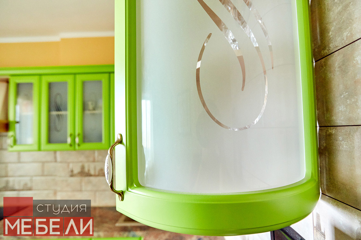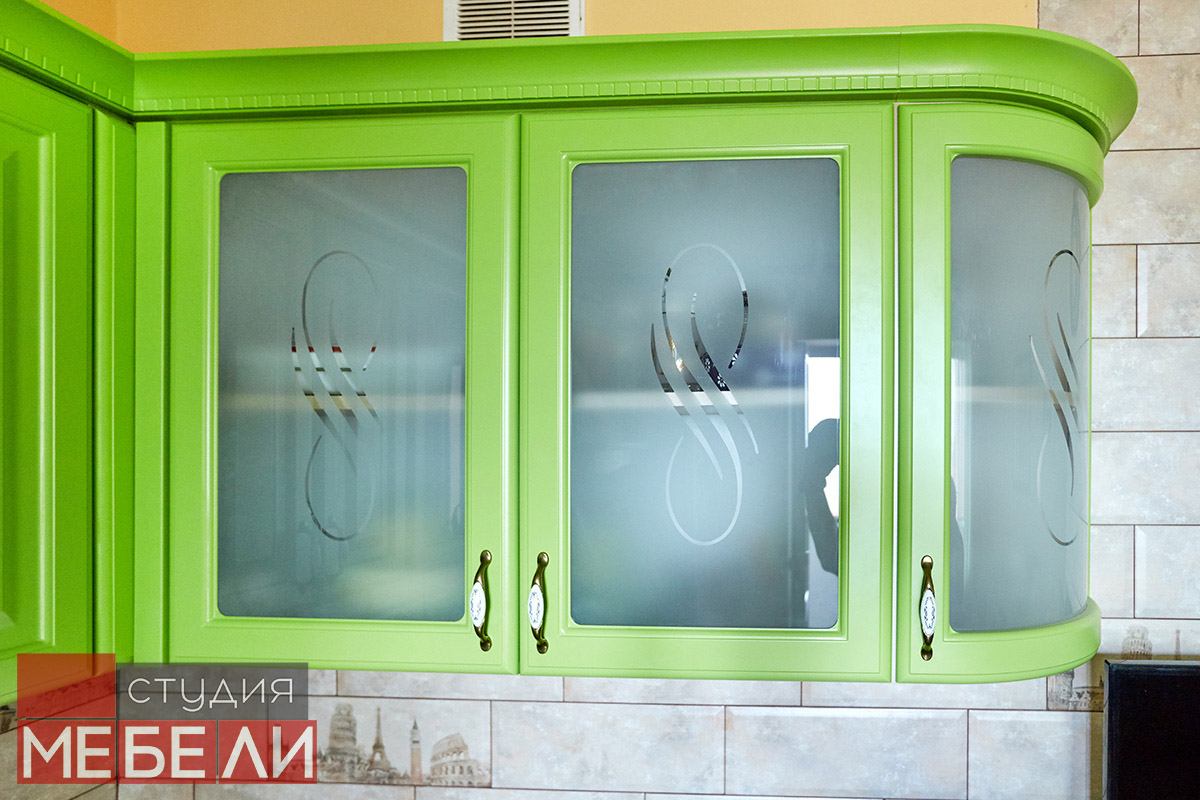 Яркая кухня насыщенного салатового цвета из крашенного МДФ «Париж ZOV191» способна поднять настроение всем жителям квартиры. Дополнив гарнитур светло коричневой столешницей RESOPAL 3458-HW, наши специалисты разработали дизайн, напоминающий природные мотивы и любой прием пищи на кухне превращается в пикник. Дополнительными элементами, придающими уникальность являются изящные ручки и большие витражные стекла с рисунками.
