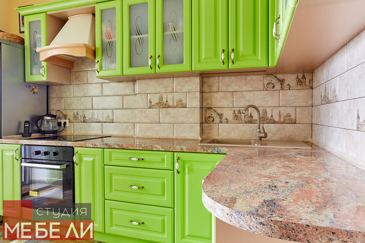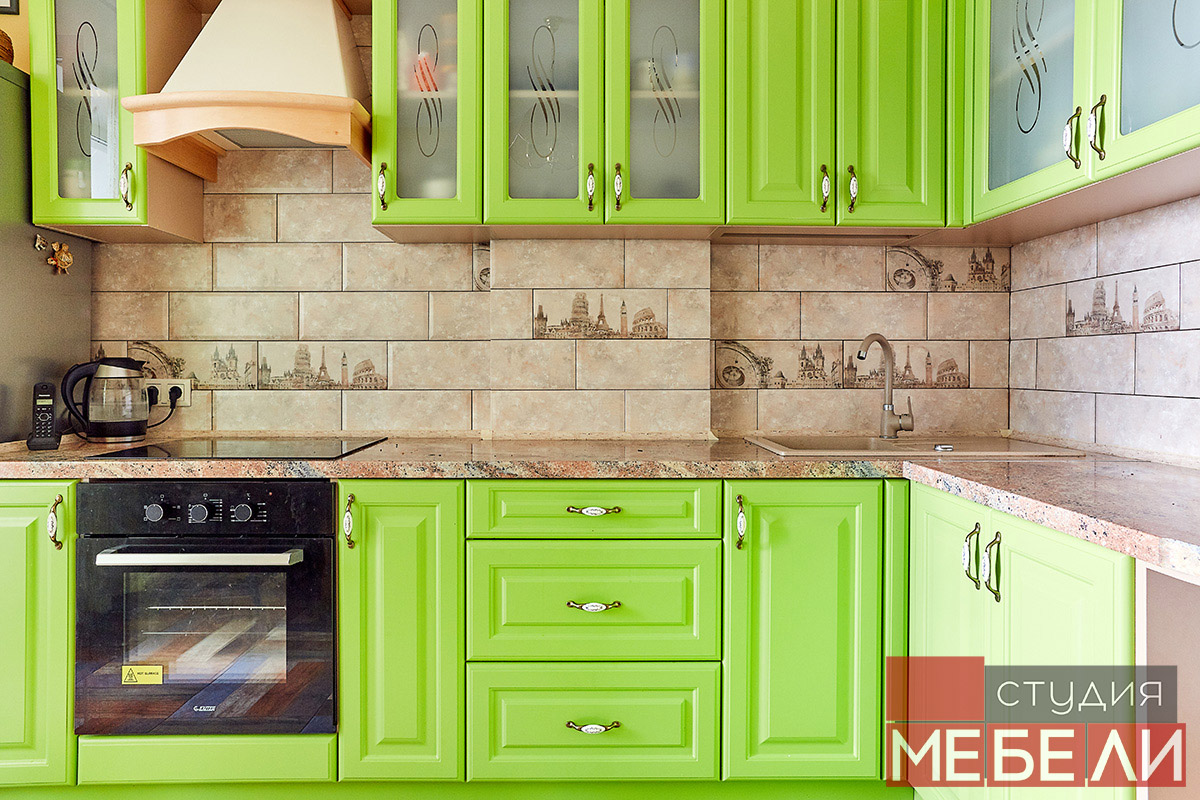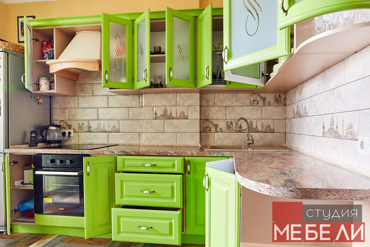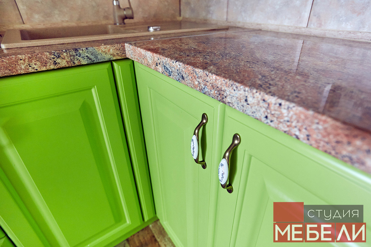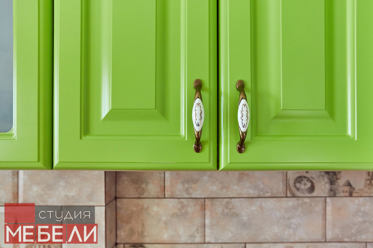 Яркая кухня насыщенного салатового цвета из крашенного МДФ «Париж ZOV191» способна поднять настроение всем жителям квартиры. Дополнив гарнитур светло коричневой столешницей RESOPAL 3458-HW, наши специалисты разработали дизайн, напоминающий природные мотивы и любой прием пищи на кухне превращается в пикник. Дополнительными элементами, придающими уникальность являются изящные ручки и большие витражные стекла с рисунками.