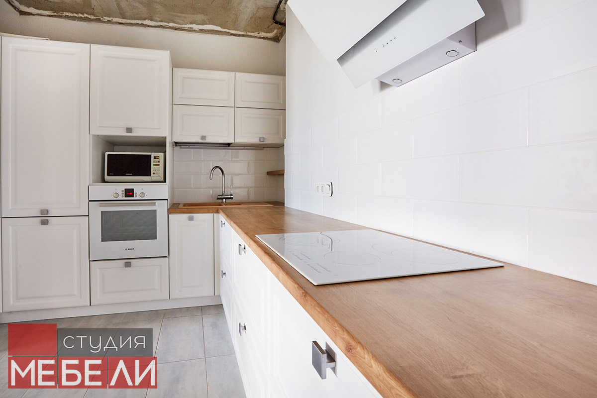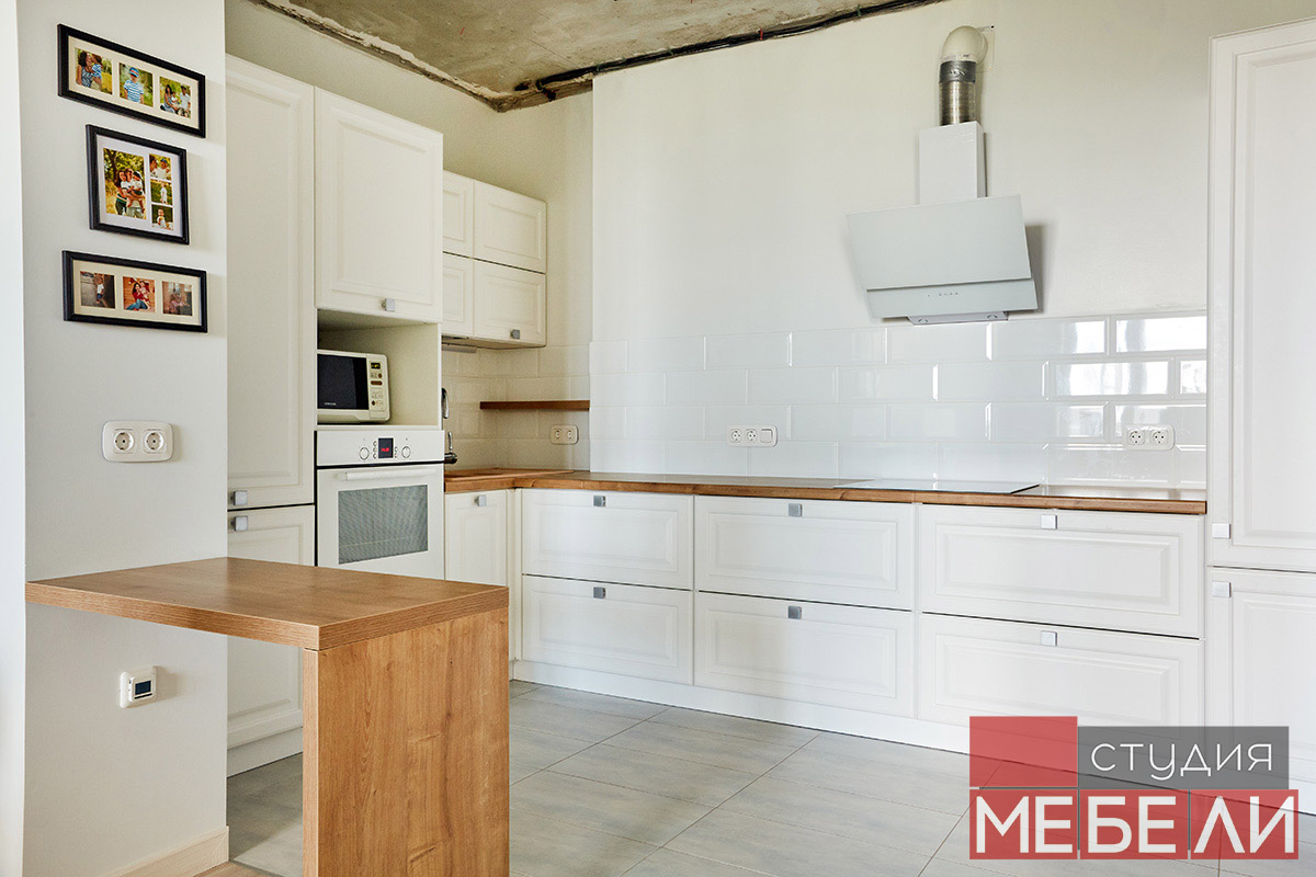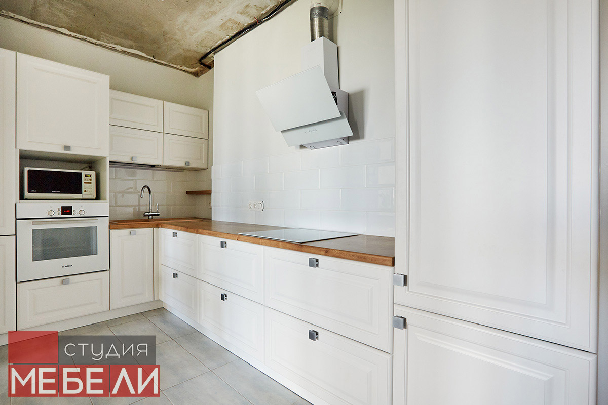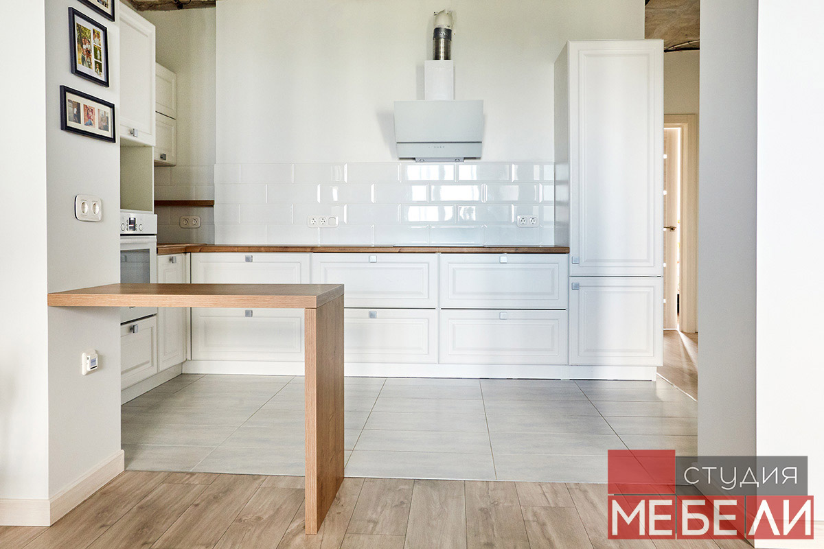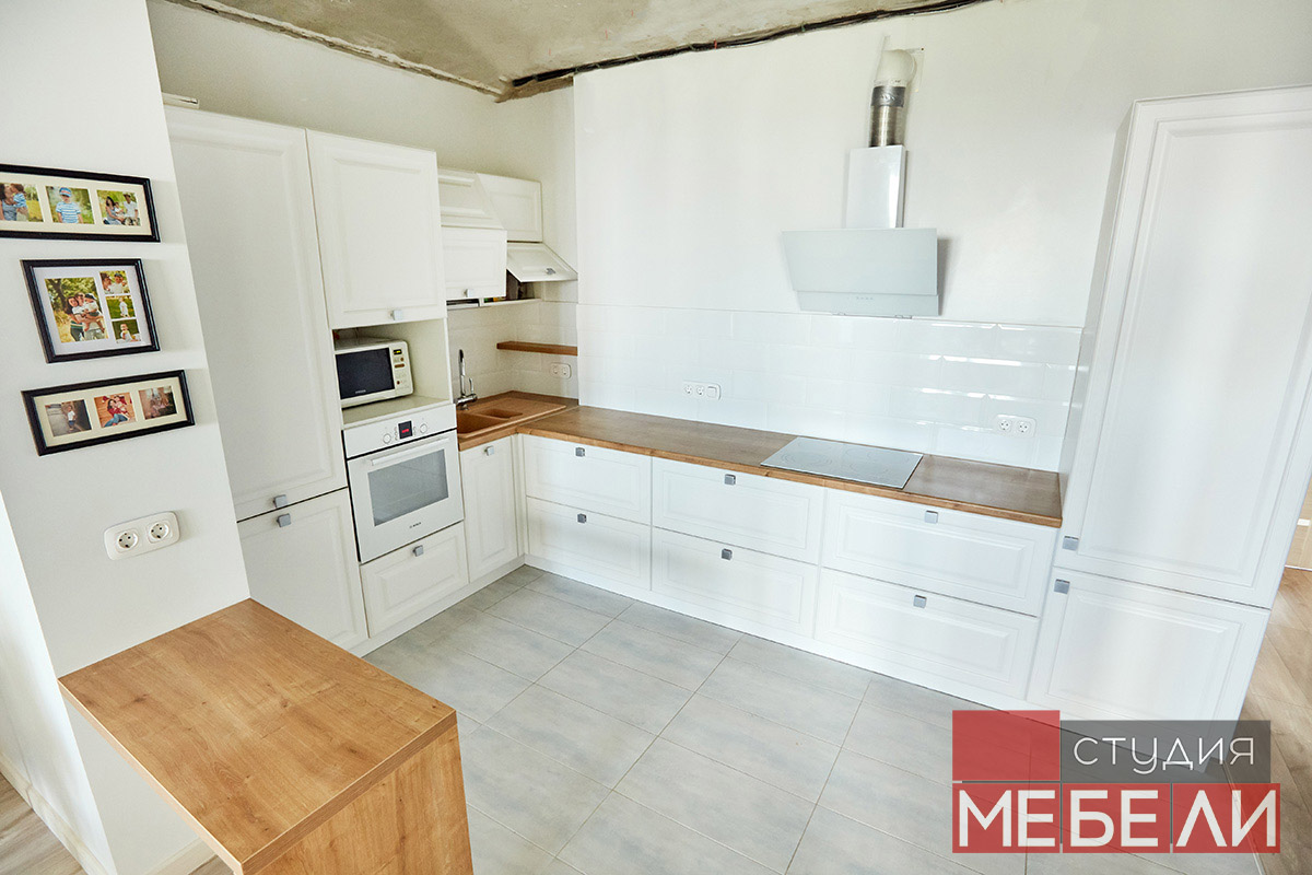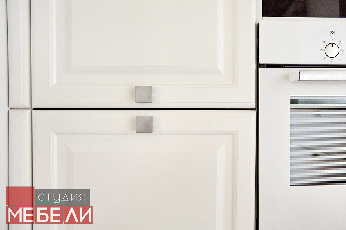 Предпочитаете светлые тона в интерьере? Вам подойдет элегантная кухня из матового МДФ оттенка «Париж RAL9003». Минимальное количество навесных шкафов придает кухне легкость и создает визуальное впечатление большего свободного пространства. Cтолешница постформинг «туя» не только оттеняет светлый фасад, но и является экологически безопасной для продуктов. Еще одним дизайнерским решением наших специалистов является вытяжка DACH NUBIA 60. Притягивающее своим видом устройство прекрасно выполняет свои основные функции и разбавляет классический интерьер технологичным дизайном.