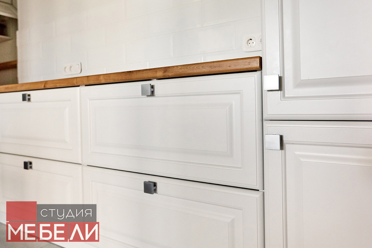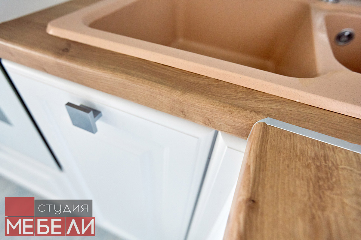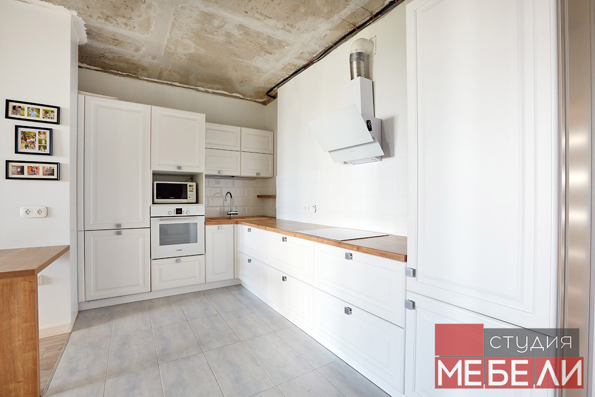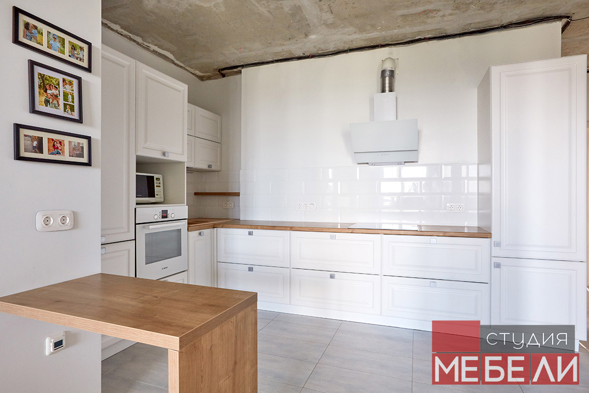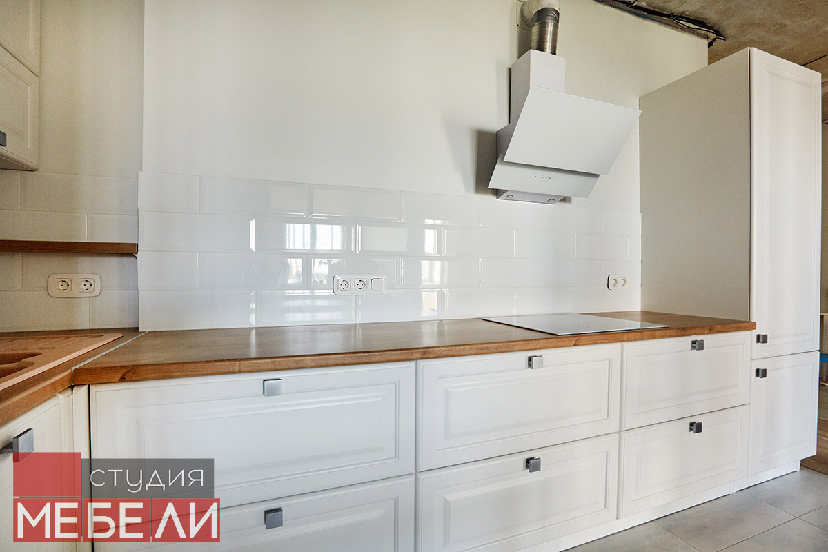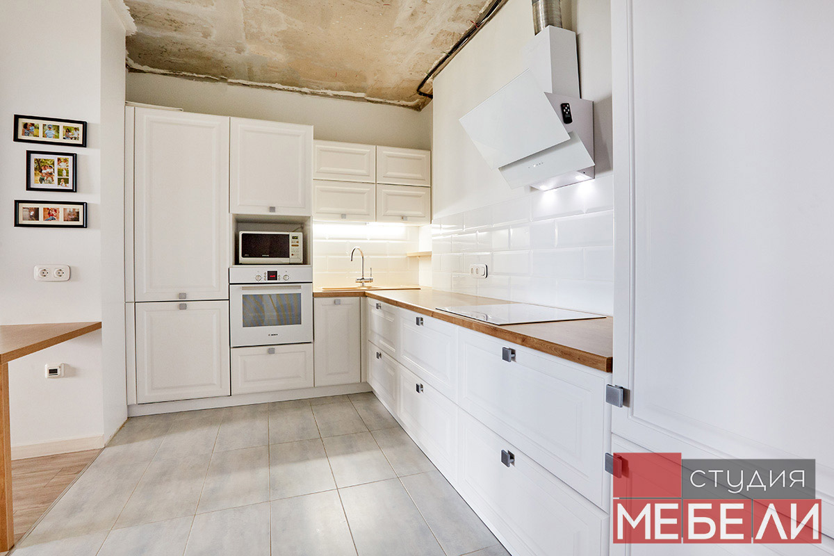Предпочитаете светлые тона в интерьере? Вам подойдет элегантная кухня из матового МДФ оттенка «Париж RAL9003». Минимальное количество навесных шкафов придает кухне легкость и создает визуальное впечатление большего свободного пространства. Cтолешница постформинг «туя» не только оттеняет светлый фасад, но и является экологически безопасной для продуктов. Еще одним дизайнерским решением наших специалистов является вытяжка DACH NUBIA 60. Притягивающее своим видом устройство прекрасно выполняет свои основные функции и разбавляет классический интерьер технологичным дизайном.