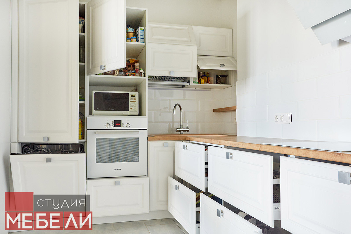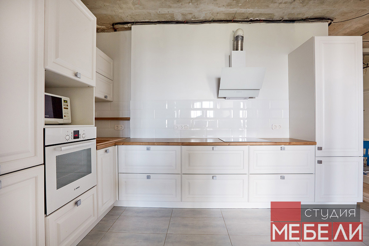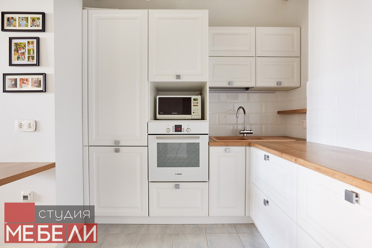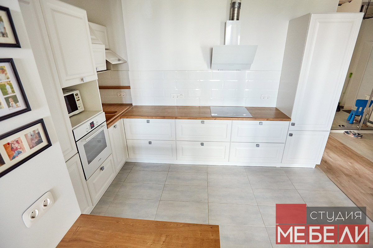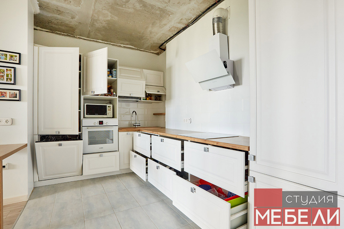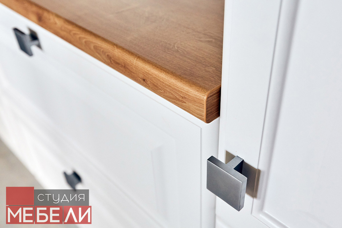 Предпочитаете светлые тона в интерьере? Вам подойдет элегантная кухня из матового МДФ оттенка «Париж RAL9003». Минимальное количество навесных шкафов придает кухне легкость и создает визуальное впечатление большего свободного пространства. Cтолешница постформинг «туя» не только оттеняет светлый фасад, но и является экологически безопасной для продуктов. Еще одним дизайнерским решением наших специалистов является вытяжка DACH NUBIA 60. Притягивающее своим видом устройство прекрасно выполняет свои основные функции и разбавляет классический интерьер технологичным дизайном.