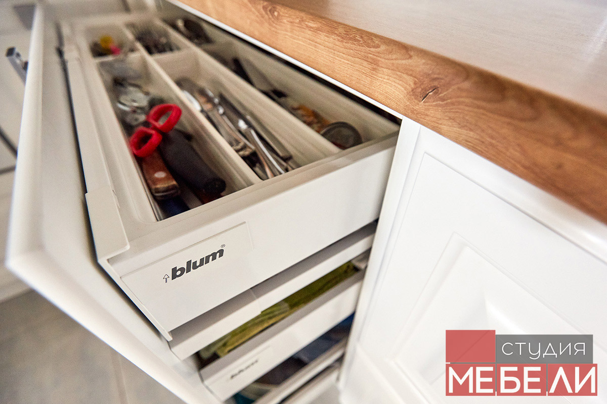 Несмотря на лаконичный внешний вид, данная кухня обладает универсальными функциональными возможностями. Полное выдвижение шуфляд и плавное их открытие обеспечивается, благодаря тандембоксам от Blum, выдерживающим большую полезную нагрузку. Все петли оснащены доводчиками, позволяющими продлить срок службы Вашей мебели: больше никаких ударов и резких хлопков на кухне! Верхние ящики оснащены подъемниками BLUM AVENTOS HF, AVENTOS HK-S, а также современным механизмом Tip-On, который обеспечивает открытие/закрытие легким прикосновением.