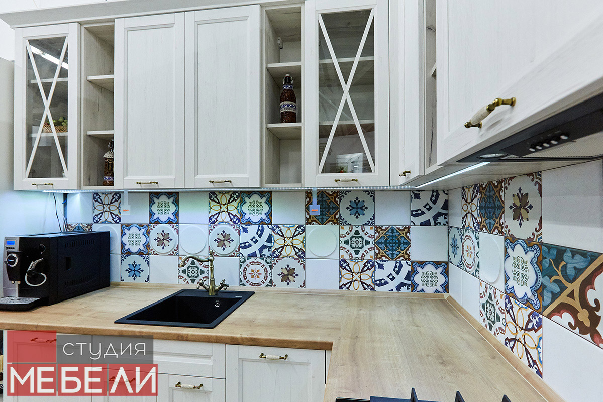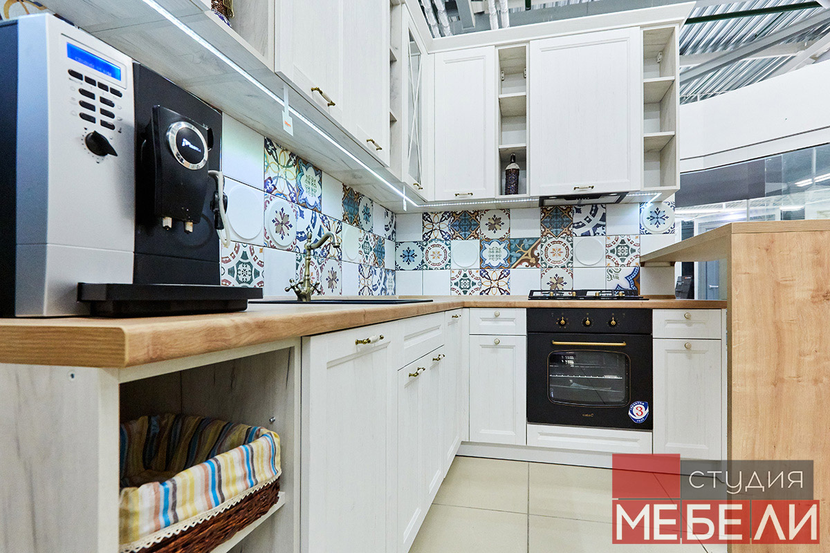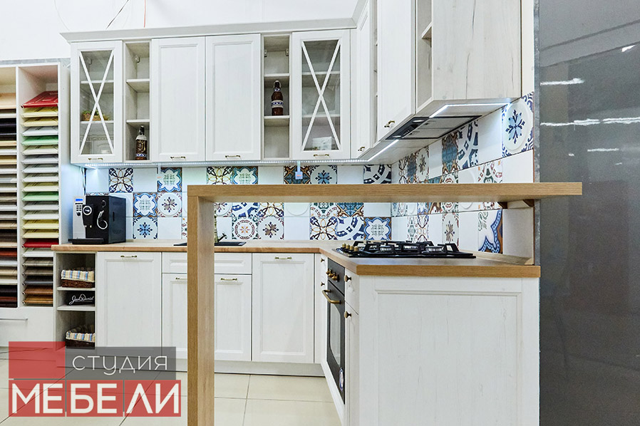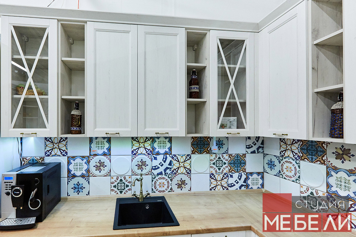 Фартук выполняет не только функциональную, но и стилистическую роль, привлекая внимание разнообразием рисунка и оттеняя светлые фасады. Большое количество открытых полок обеспечивают доступ к часто используемым кухонным принадлежностям, одновременно позволяя персонализировать Вашу кухню, разместив яркие аксессуары или фотографии. Встроенная техника CATA (Испания) выполнена в стиле ретро, однако имеет самые современные функции.
