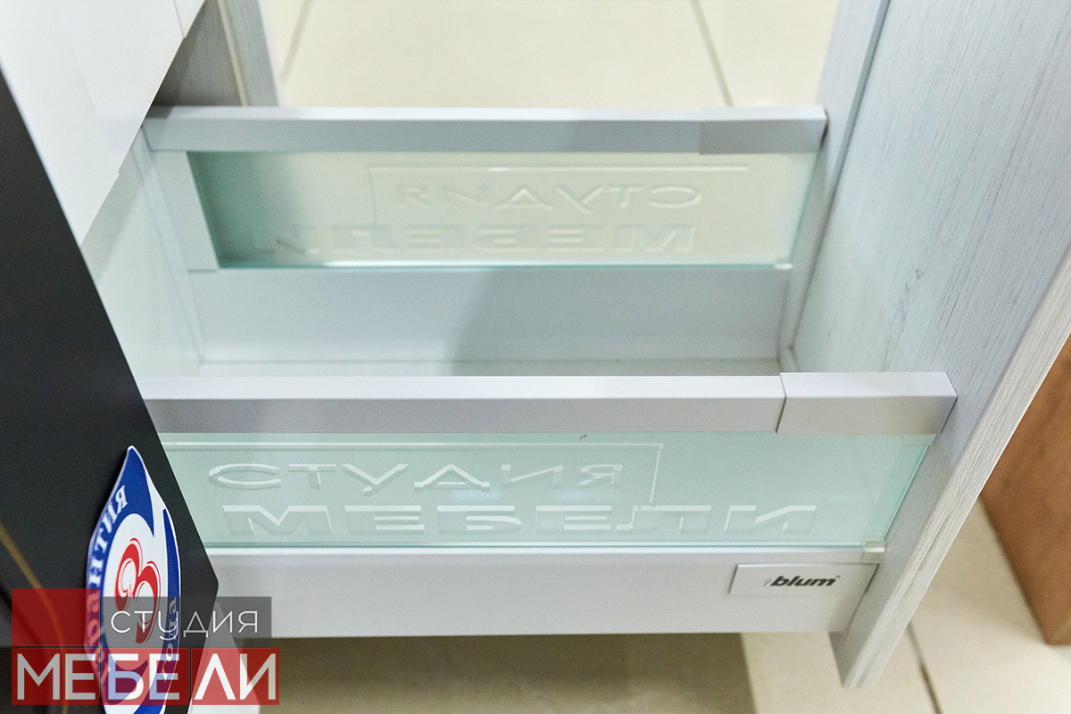 Наши специалисты позаботились о комфорте и безопасности использования кухни. Светодиодная подсветка выполняет функции дополнительного освещения и направляет равномерный свет без теней на рабочую поверхность. Выдвижные ящики оснащены направляющими тандембокс Blum Antaro со стеклянными вставками, которые имеют большую полезную нагрузку и облегчают движение шуфляд.