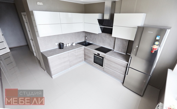 Просторная угловая кухня выдержана в нейтральных оттенках и является гармоничным продолжением общей концепции интерьера. Текстурированные нижние ящики и скинали отражают фактуру стен, а навесные шкафы белого цвета – потолка и плитки. Благодаря отсутствию ручек, фасад кухни выглядит целостным и однородным. Стильным акцентирующим решением стали мойка из искусственного камня и вытяжка черного цвета.