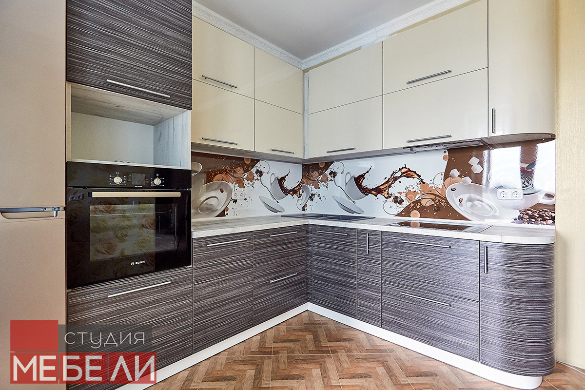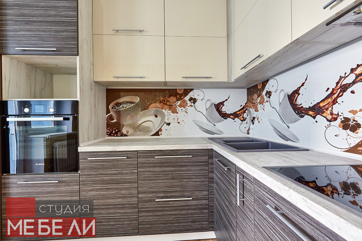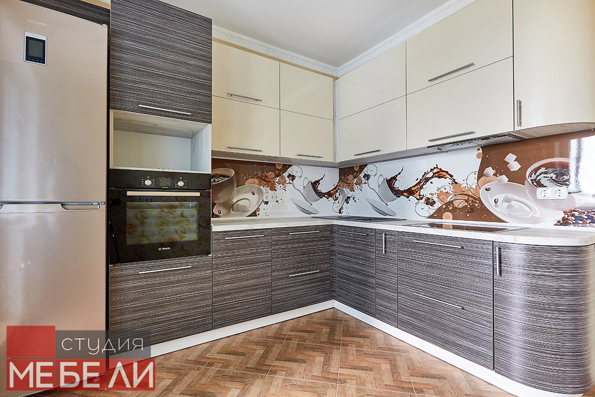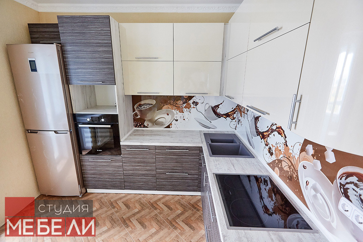 Любите уют и теплые кофейные оттенки? Комбинированная кухня станет для Вас подходящим выбором. Нижний ярус выполнен из постформинга оттенка «Зембрано темный» и имеет характерную древесную текстуру. Верхние ящики реализованы в бежевом цвете, что визуально разгружает пространство, делая Вашу кухню легче и просторнее. Дополнительный акцентом, сглаживающим переход от темных оттенков к светлым, служит столешница RESOPAL 4159-WH. А уникальной изюминкой стали фотоскинали на кофейную тематику, которые помогут взбодриться даже самым сонным утром.
