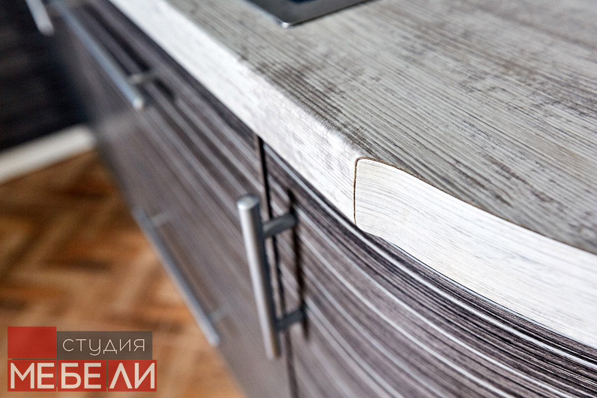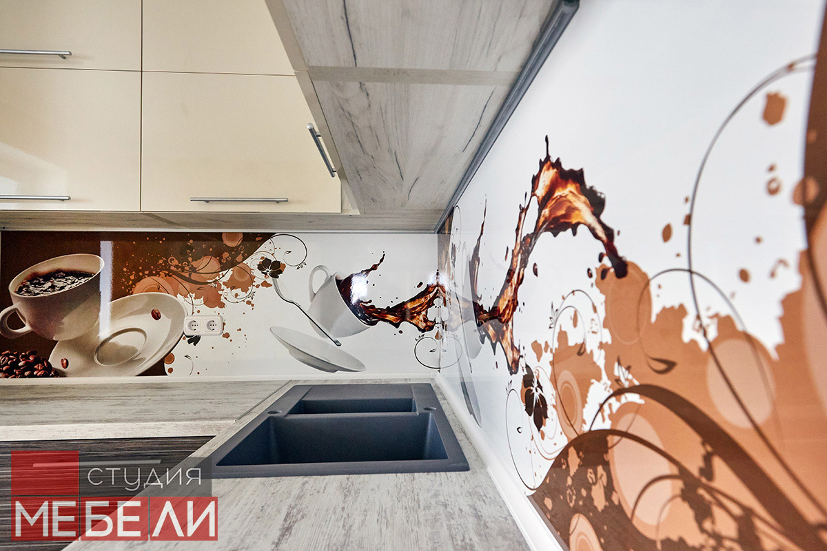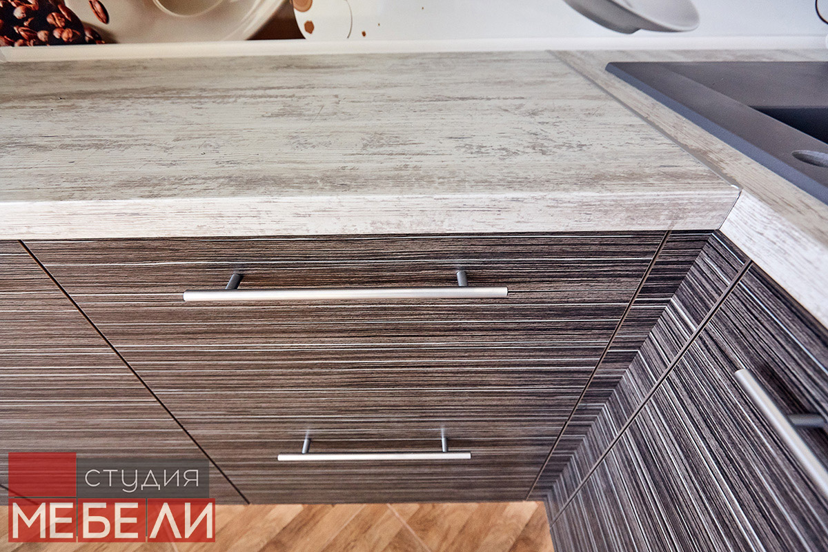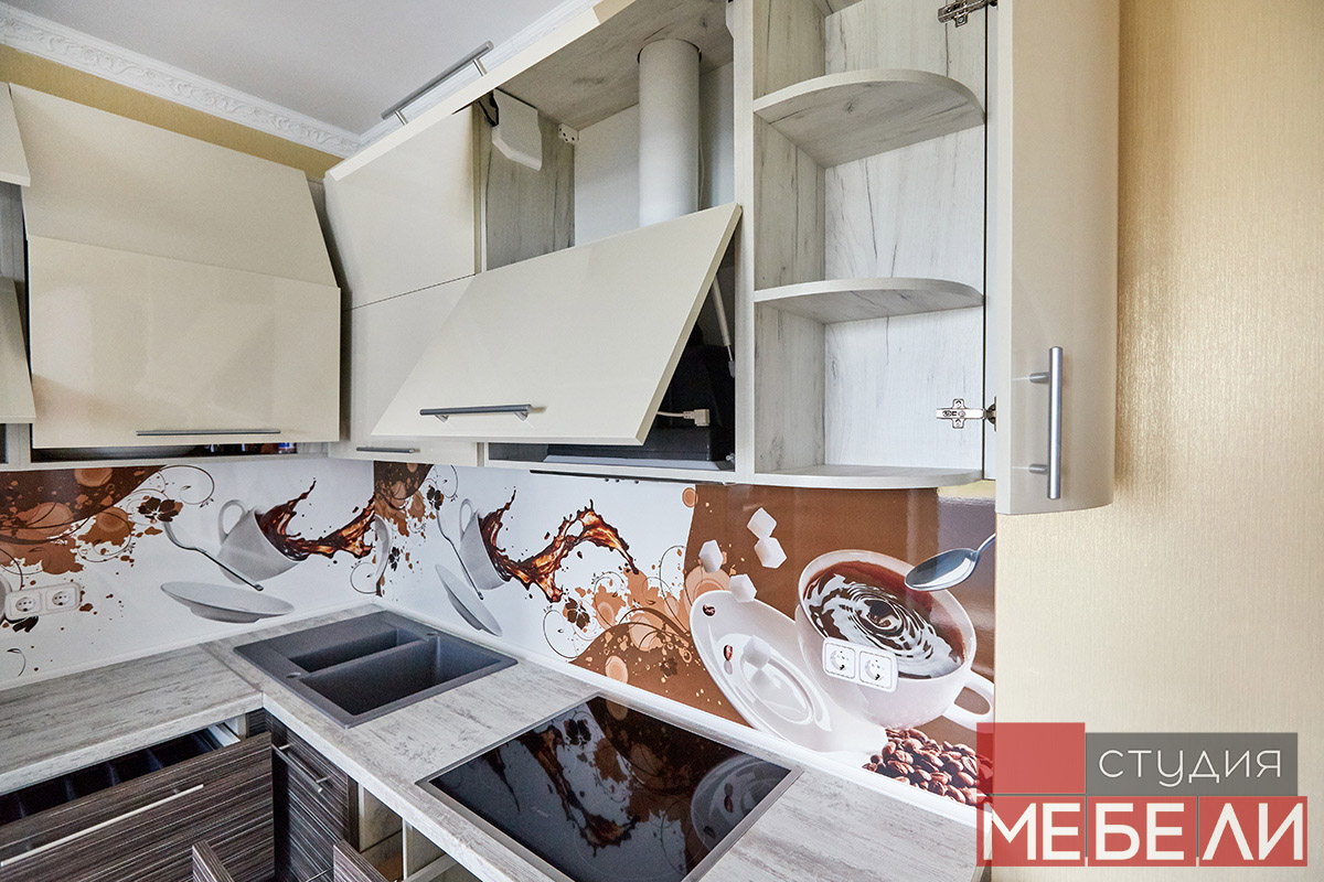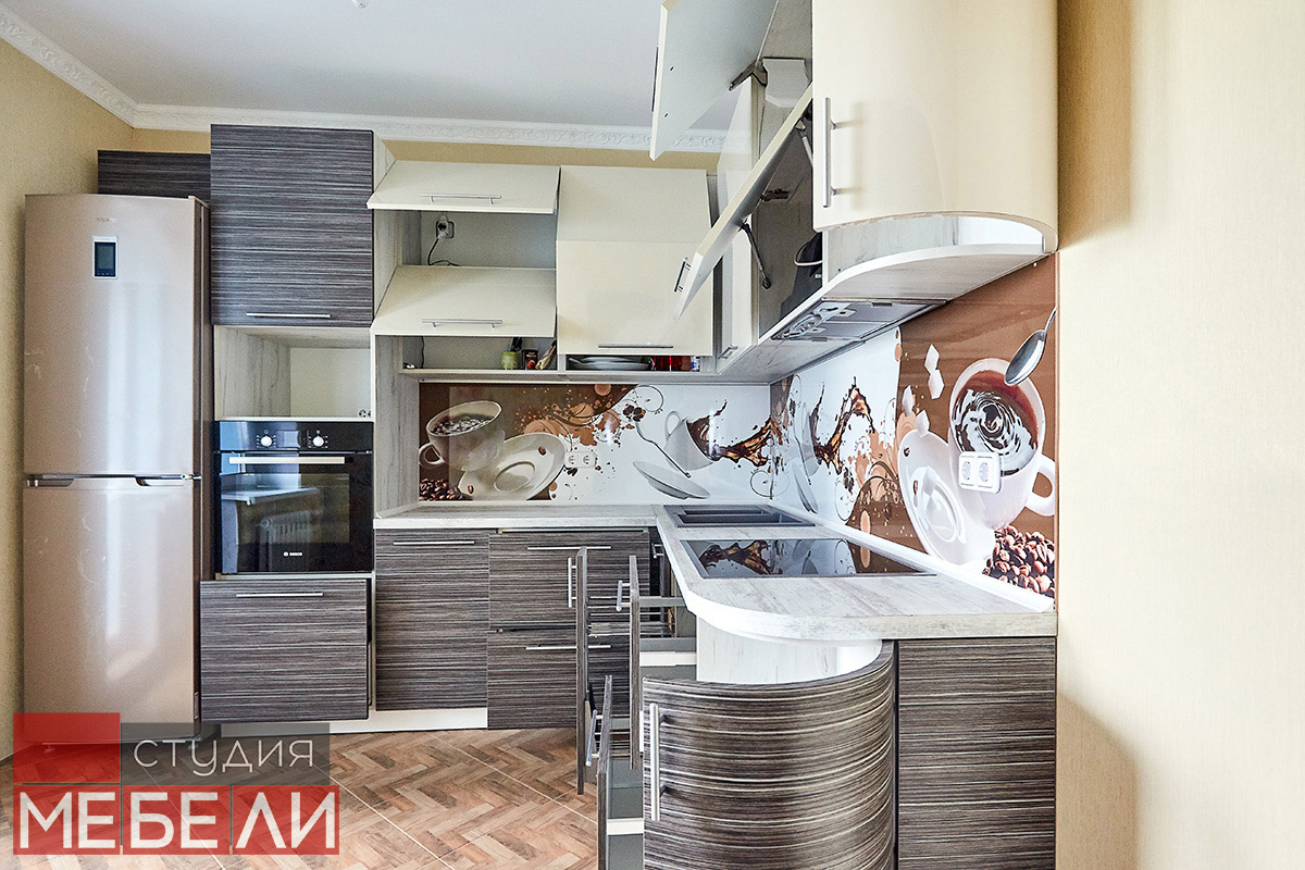 Любите уют и теплые кофейные оттенки? Комбинированная кухня станет для Вас подходящим выбором. Нижний ярус выполнен из постформинга оттенка «Зембрано темный» и имеет характерную древесную текстуру. Верхние ящики реализованы в бежевом цвете, что визуально разгружает пространство, делая Вашу кухню легче и просторнее. Дополнительный акцентом, сглаживающим переход от темных оттенков к светлым, служит столешница RESOPAL 4159-WH. А уникальной изюминкой стали фотоскинали на кофейную тематику, которые помогут взбодриться даже самым сонным утром.