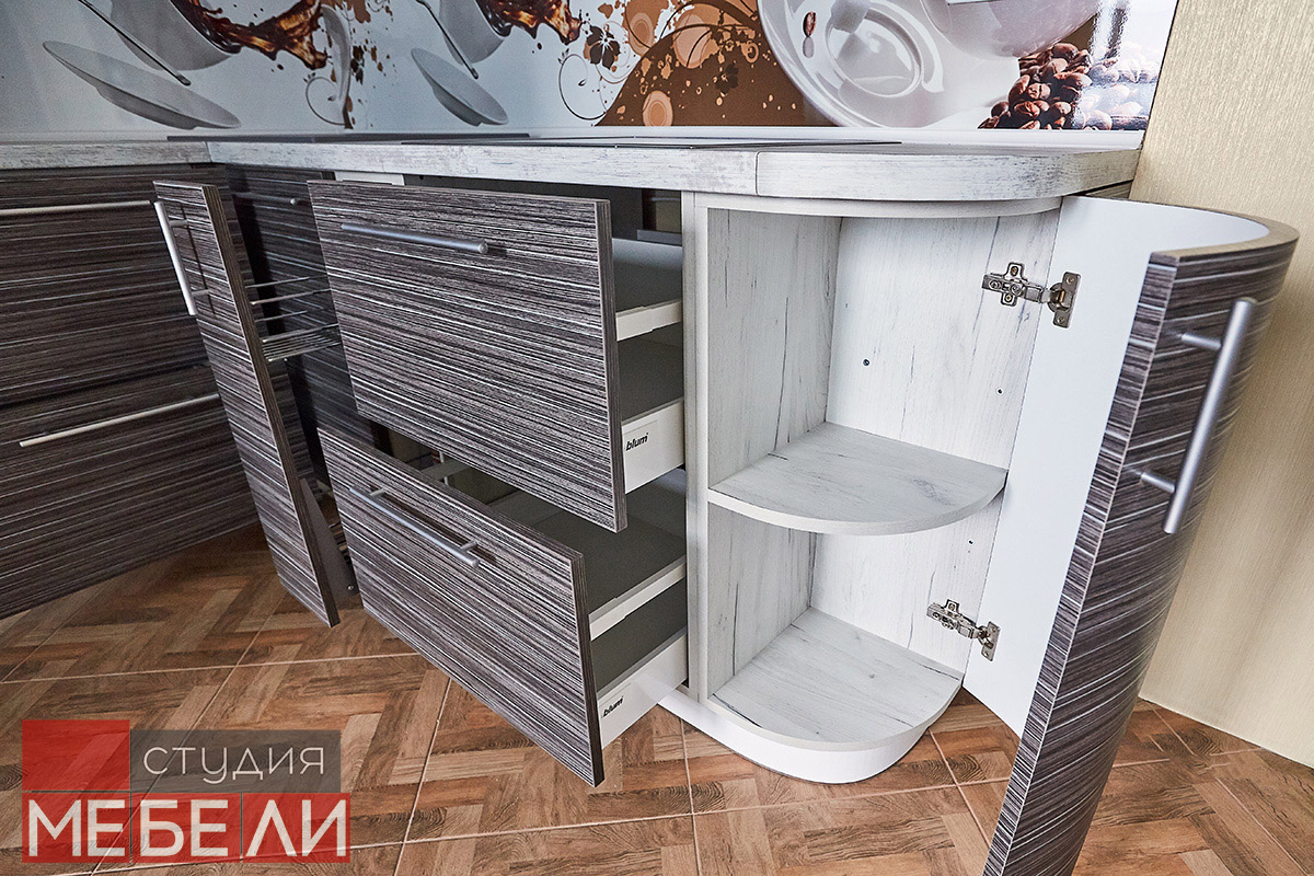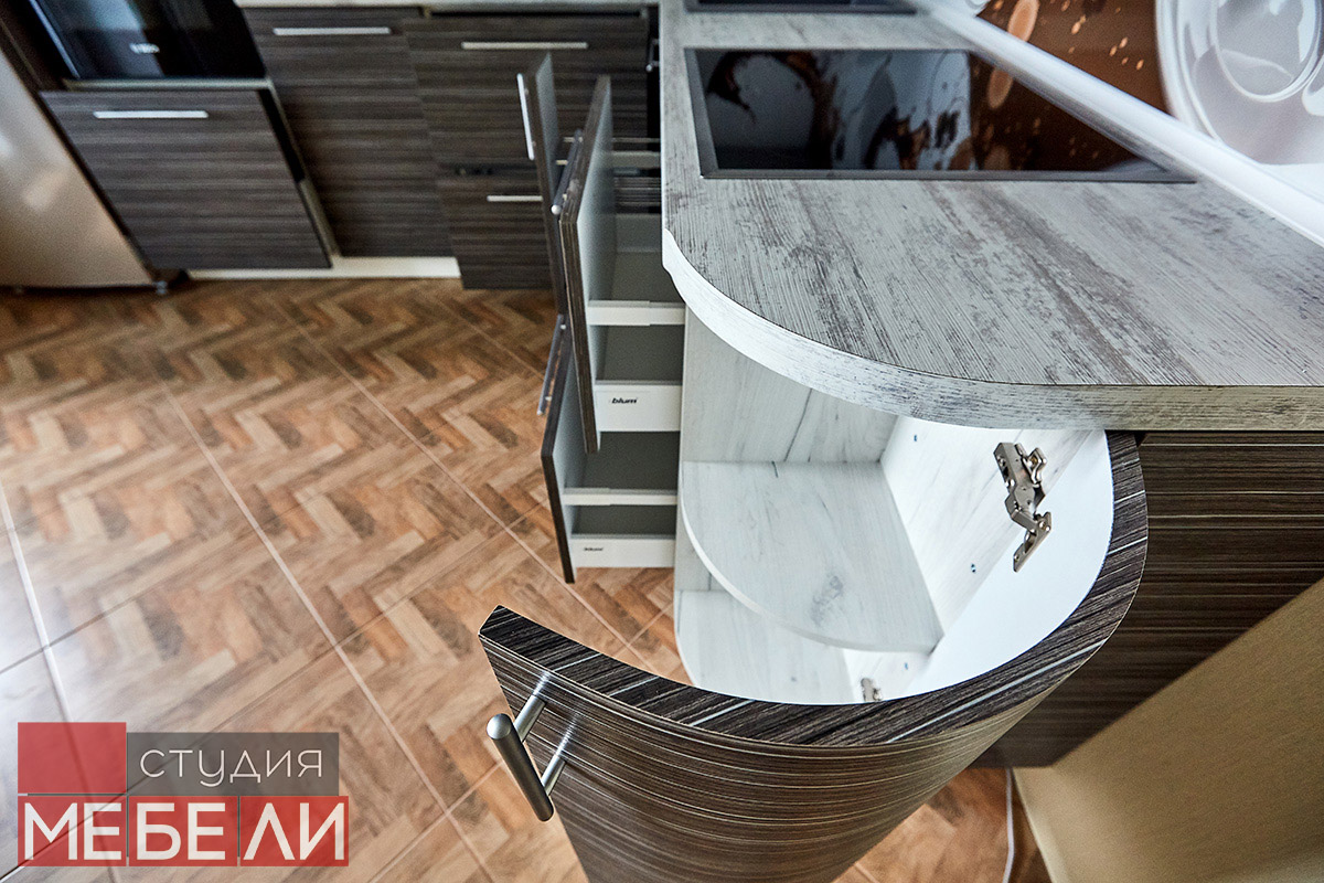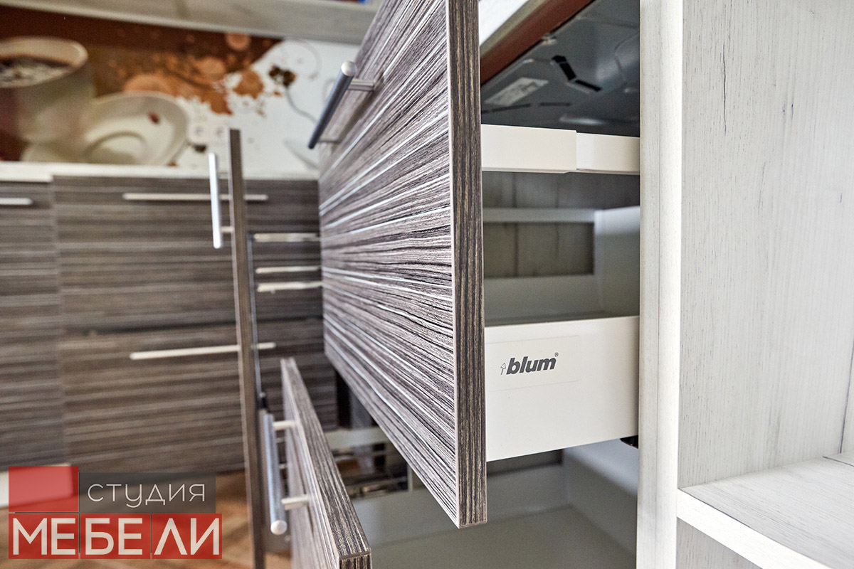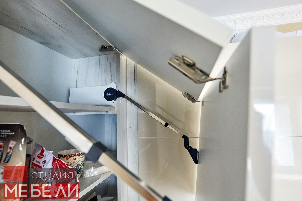 При изготовлении мебели, наши специалисты используют только качественную фурнитуру от известных европейских производителей. Комфорт движения шуфляд обеспечивается за счет выдвижных тандембоксов BLUM, выдерживающих большую полезную нагрузку. Экономию пространства в верхней зоне обеспечивают подъемные механизмы BLUM AVENTOS, и в том числе, складные подъемники AVENTOS HF, гарантирующие остановку в любом положении. Такая фурнитура не только отлично выполняет свои функции, но и делает процесс использования более эргономичным.