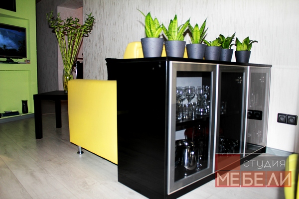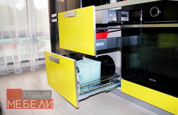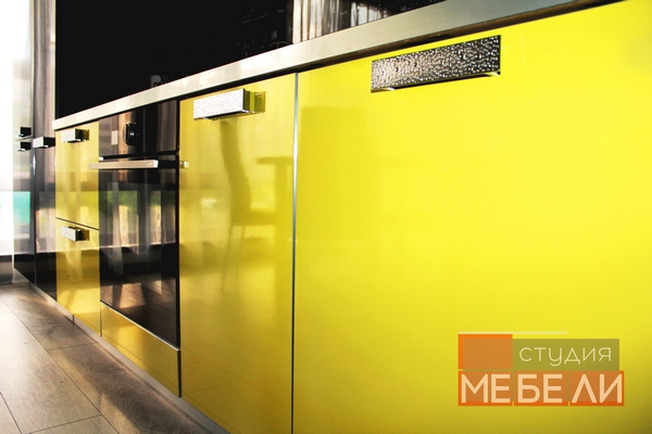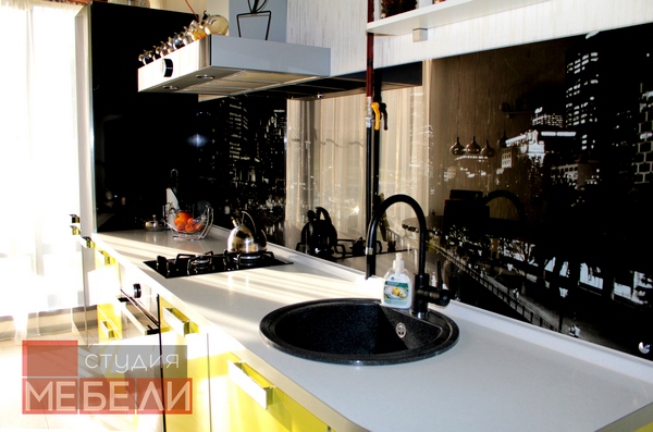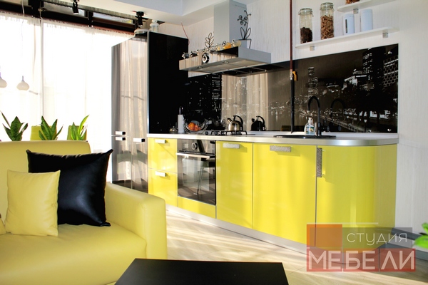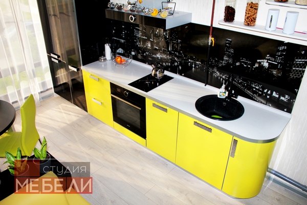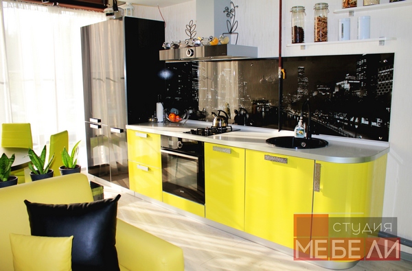 Наши дизайнеры рады предложить Вам еще один яркий и запоминающийся интерьер кухни. Фасады из пластика «Цитрус глянец» имеют насыщенный лимонный цвет, в противовес им – черный постформинг и фотоскинали с видами ночного города. Верхние ящики заменены несколькими открытыми полками, которые не только визуально разгружают пространство, но и позволяют разместить часто используемые предметы или дополнительные аксессуары. Завершает цветовое решение встраиваемая техника Gorenje дизайнерской коллекции Simplicity, мойка и смеситель черного цвета.