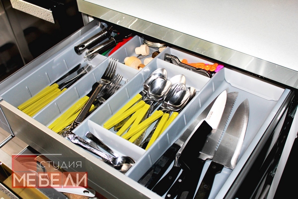 В связи с отсутствием верхнего яруса наши специалисты постарались максимально полезно использовать отведенное пространство. Так, для компактности и удобства хранения вещей, в кухню встроена выдвижная колонна Kargo-maxi. Сушка для посуды непривычно, но весьма удобно расположена в нижнем ярусе. Ящики оснащены современной фурнитурой: комфорт при выдвижении шуфляд обеспечивается за счет использования тандембоксов от Hettich, а плавное и широкое открытие шкафчиков гарантируется благодаря петлям с доводчиками Sensys.