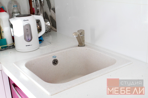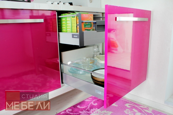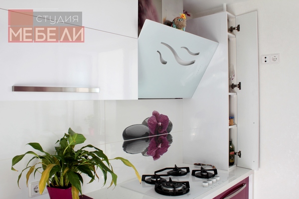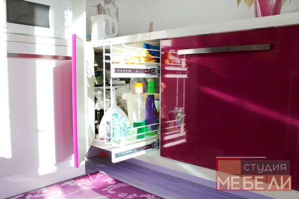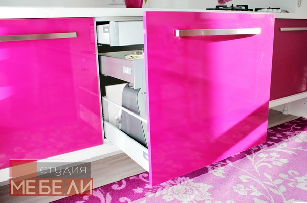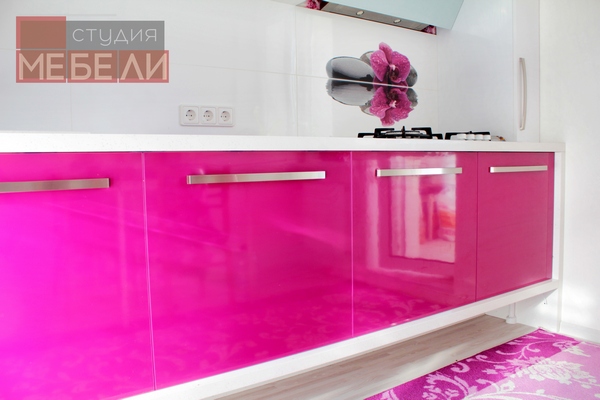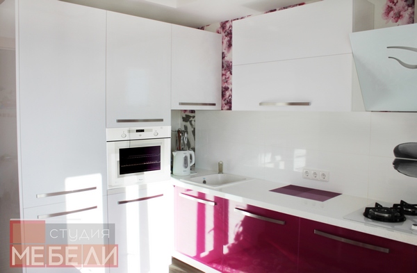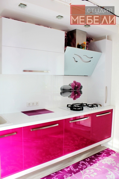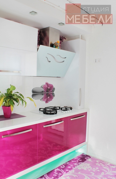 Гигиеничный и влагостойкий пластик, выбранный в качестве материала не только придает кухне лоска, но и значительно упрощает уход за мебелью. Органичным элементом интерьера является белая столешница с фиолетовыми вставками, дополнительно акцентирующая яркость фуксии.