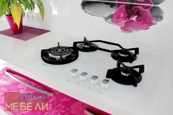 Интерес к данному интерьеру вызывает дизайнерский выбор цвета гарнитура. Оттенок цветка фуксия отличается насыщенностью и энергичностью. Использование данного цвета в интерьере позволит поднять настроение и придать бодрости даже в самый пасмурный день. Вместе с тем, яркие фасады нижнего яруса сглаживаются белыми шкафами и не приедаются.